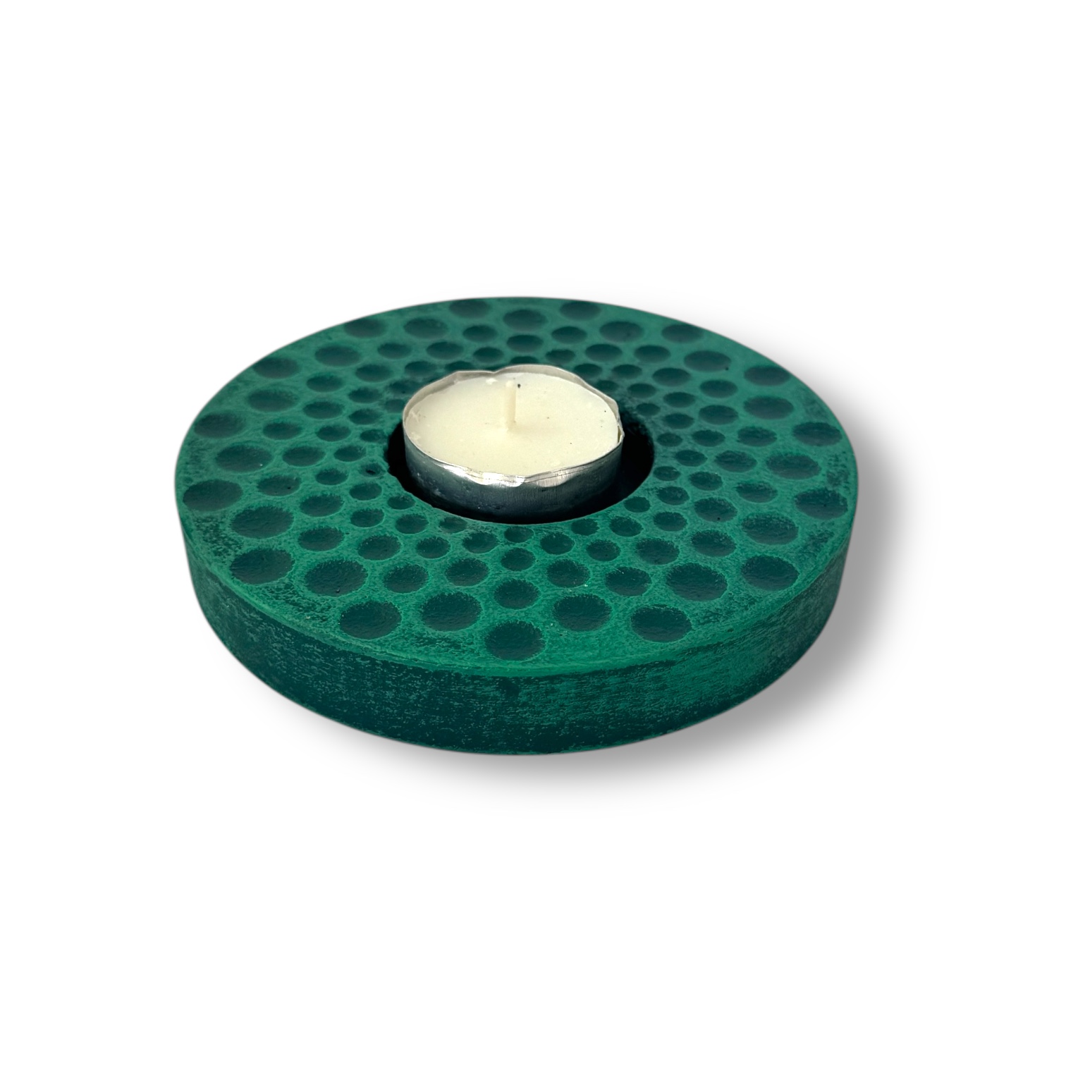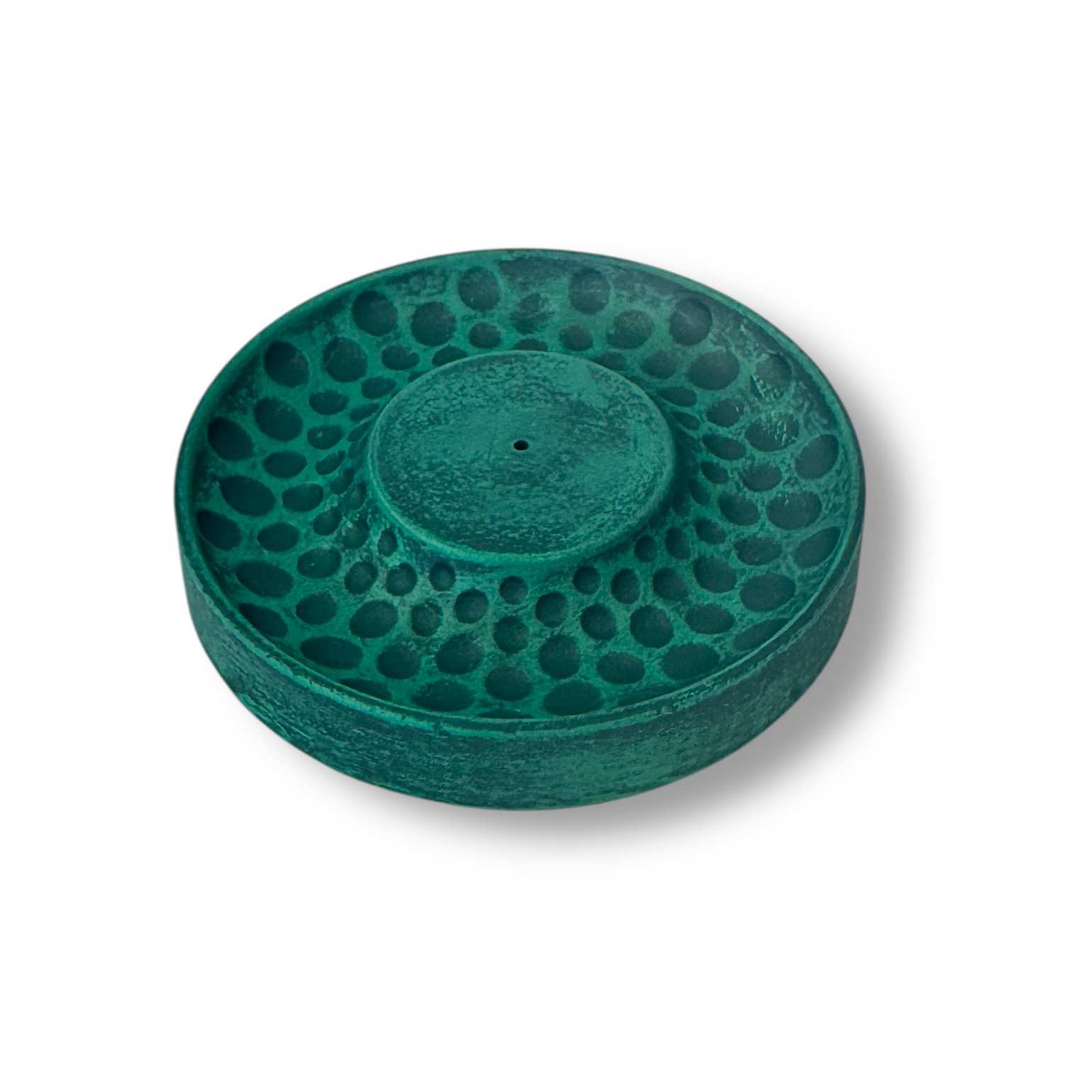 Die flache Scheibenform liegt satt und schwer auf jedem Untergrund. Auf der einen Seite bietet sie Platz für ein handelsübliches Teelicht – auf der anderen Seite eine feine Bohrung für klassische Räucherstäbchen. Die fein strukturierte Oberfläche ist nicht nur ein visuelles Highlight, sondern auch angenehm griffig.