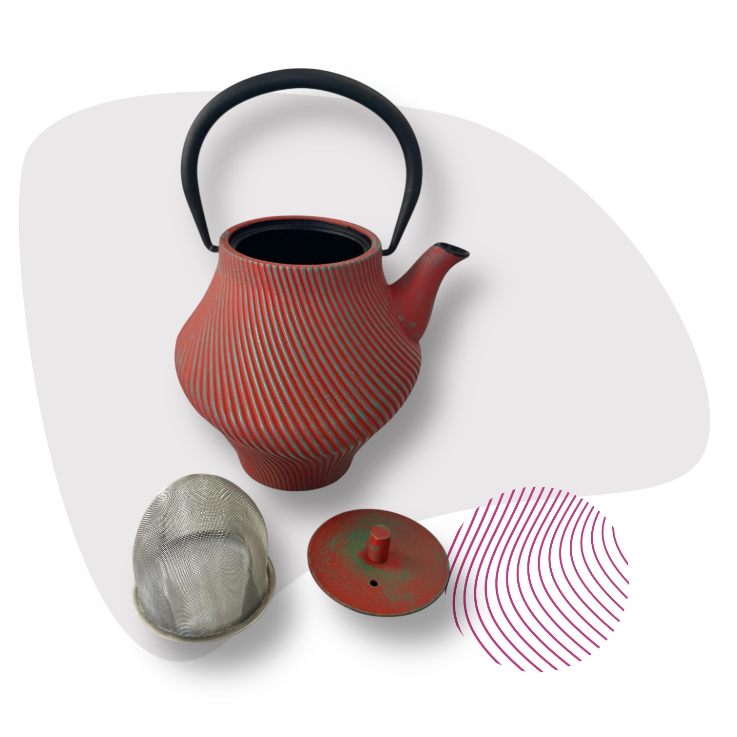 Kunstvoll gebogen – Gusseiserne Teekanne in Rot-Türkis